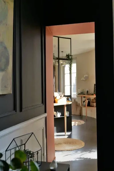 L'espace unifié et débarrassé de son faux plafond lambrissé retrouve son élégance originelle. Les lignes galbées de son nouvel aménagement, le choix des matériaux (acier, chêne trois plis, granit noir) créent clairs obscurs et intimité.