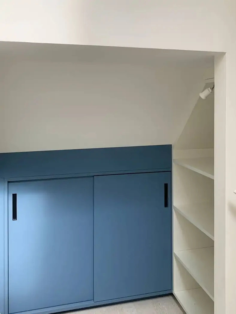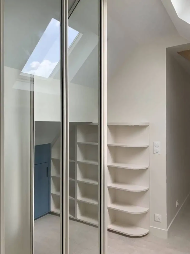 Le plancher est réhaussé pour conserver un volume suffisamment confortable ainsi les espaces sous rampants sont agencés sur mesure.