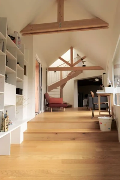 Ce nouvel espace offre désormais une vue plongeante sur le jardin . Il est à la fois un espace de déambulation, un coin lecture ...et circonscrit un petit patio tourné vers la campagne.