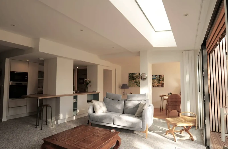 Le "salon séjour "au premier plan, profite de la verriére de l'extension , sous les feux de la rampe.
