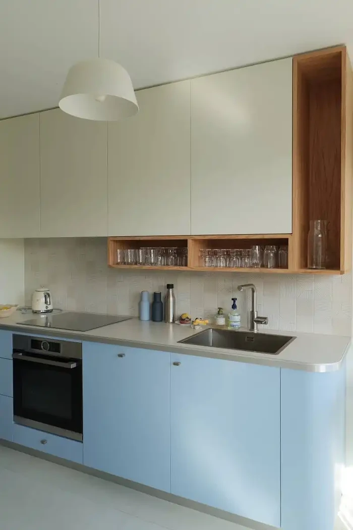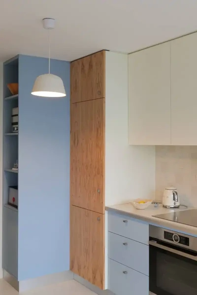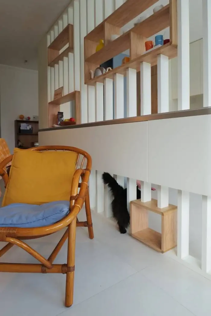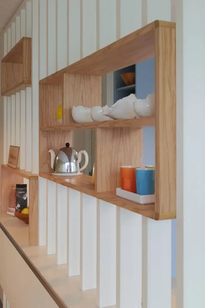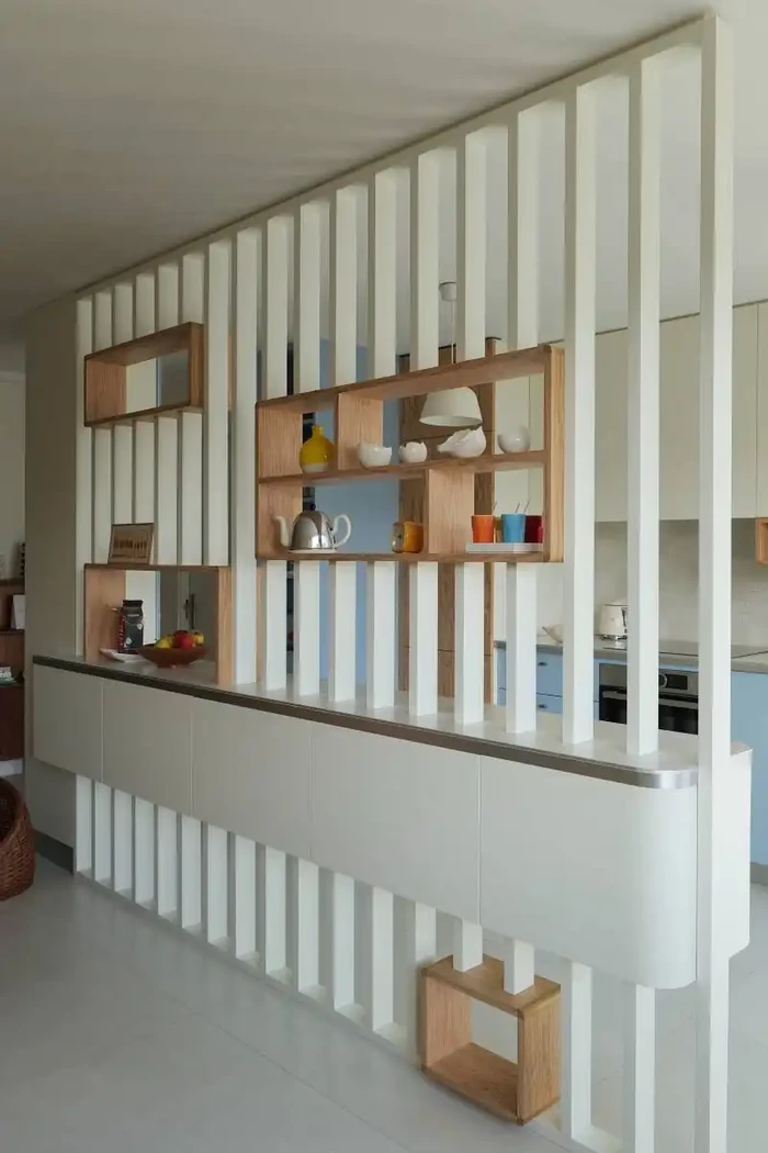 La métamorphose s’opère au moyen d’un filtre : un brise vue laqué et paré de plaquage olivier.